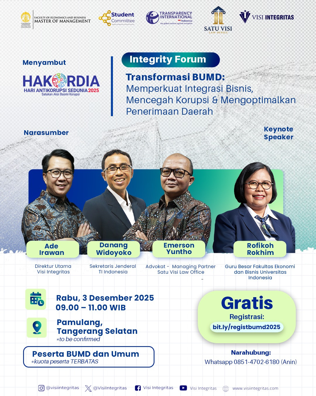 Melalui forum ini, Satu Visi Law Office dan Visi Integritas berharap para pengelola BUMD dapat mengintegrasikan kinerja finansial yang kuat dengan integritas bisnis yang kokoh demi mendukung pertumbuhan ekonomi nasional.